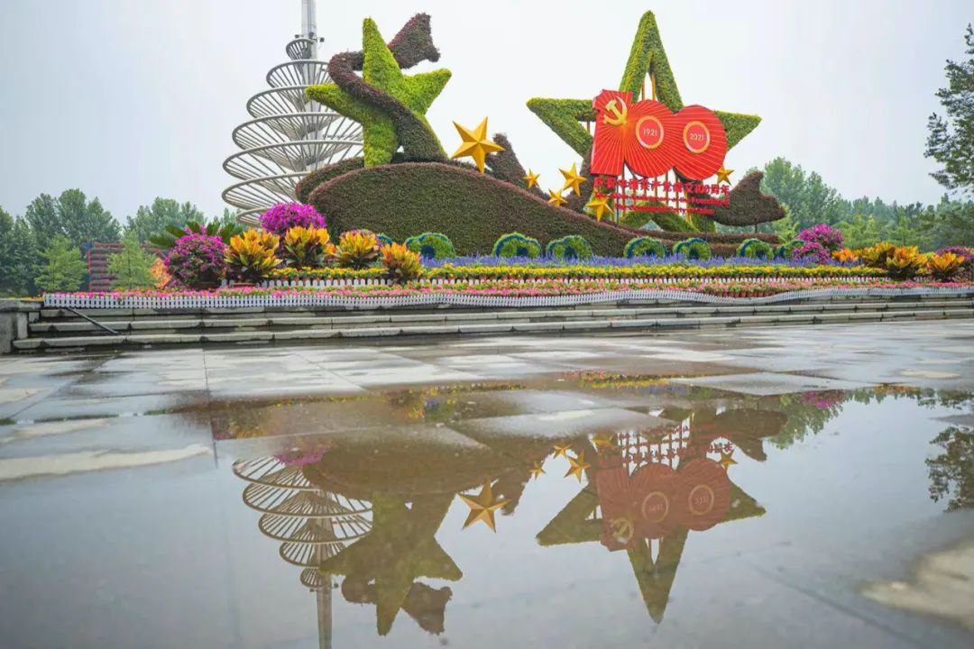 “美丽答卷”——“书写亦庄答卷 迎接建党百年”,布设位置:博大大厦南广场。花坛用红旗状的红色画卷为主体景观,同时配以北京经开区建筑剪影、100年标识,象征着经开区的发展始终聚焦人民群众对美好生活的向往,以发展建设的优异成绩,为建党百年献礼。花坛高6m,地摆花坛390㎡。