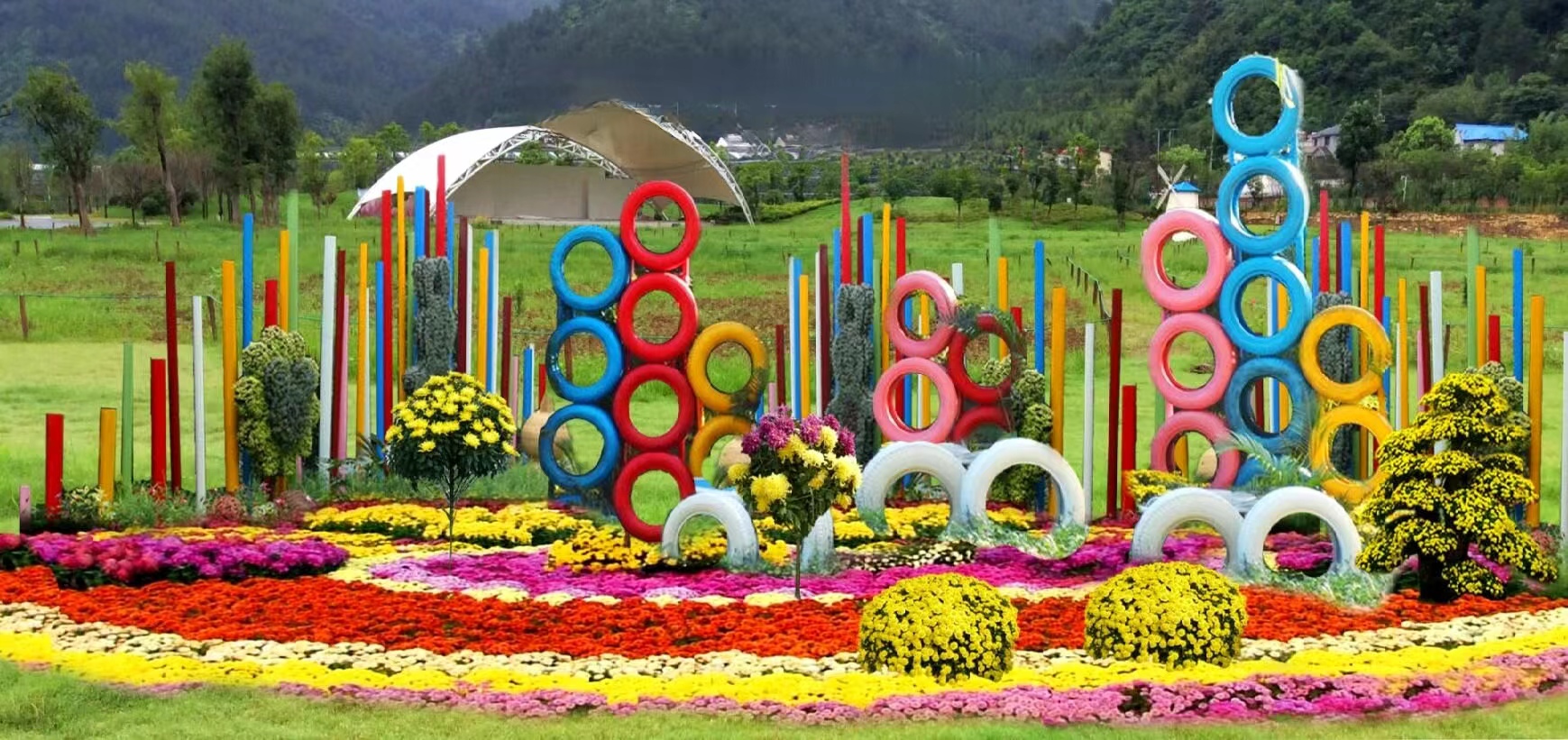 此处以废旧轮胎和PVC管材为原材料,布置立面景观,体现绿色环保的生态理念。彩色带状花境上布置菊树、盆景、菊球多种栽培形式,景观效果层次丰富、色彩明快、形式灵动跳跃,风格简约时尚,给人丰富的视觉效果。